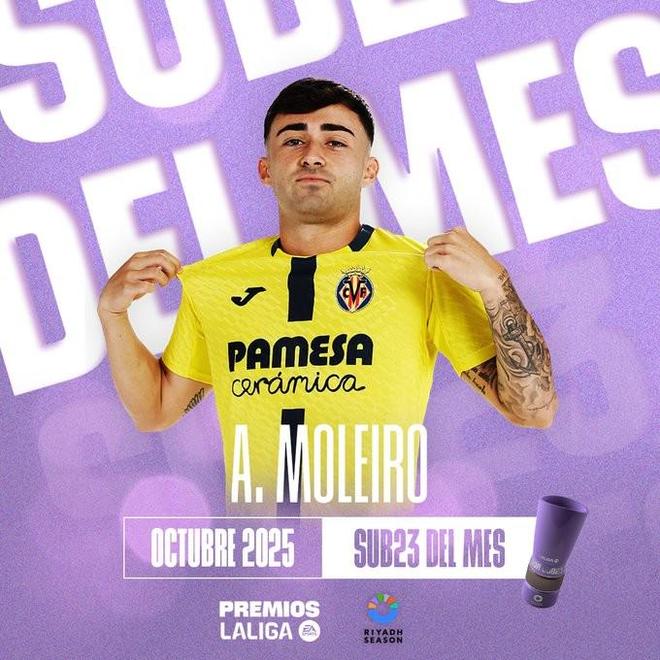 官方消息,比利亚雷亚尔前锋莫莱罗当选西甲10月最佳U23球员。